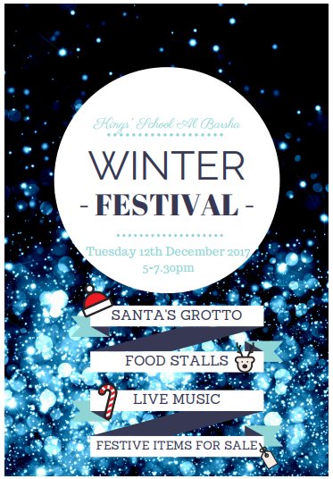 Come along to Kings' School Al Barsha's Winter Festival to enjoy a variety of festive stalls, live music performed by the school's children, Santa's grotto, festive storytime, bake sale, movie screening and lots of other festive fun! Feel free to wear festive attire, all things sparkly and wintry are welcome! Timings: fromĀ 5pm till 7.30pm www.kings-edu.com/albarsha/school-calendar/