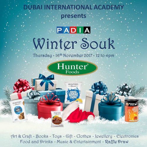 Get ready for Winter Souk at Dubai International Academy on Thursday November 16th, 2017! With their famous raffle draw, musical entertainment by the students, and Hunter Foods' Stall where we will present our school/kids friendly products, you will get into the holiday spirit straight away. From 12 to 4pm, come and have fun & joy!